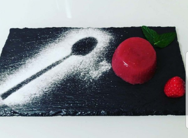 la passione mi ha portato inevitabilmente al colore rosso e di li è nata la gelatina di fragole, dolce, ma con un tocco di asprezza dato dal limone usato per la preparazione. Ma c'era bisogno anche e soprattutto della ragazza che tanto ha fatto disperare Tiziano Ferro allora è nata l'idea dell'ombra del cucchiaino creata con lo zucchero a velo. Una presenza ingombrante nel piatto ma non materiale non una presenza come lui avrebbe voluto, un qualcosa/qualcuna che comunque ha lasciato un segno tangibile nella sua vita. Provate poi a mangiarlo con il sottofondo della canzone, il piatto assume un sapore diverso.
