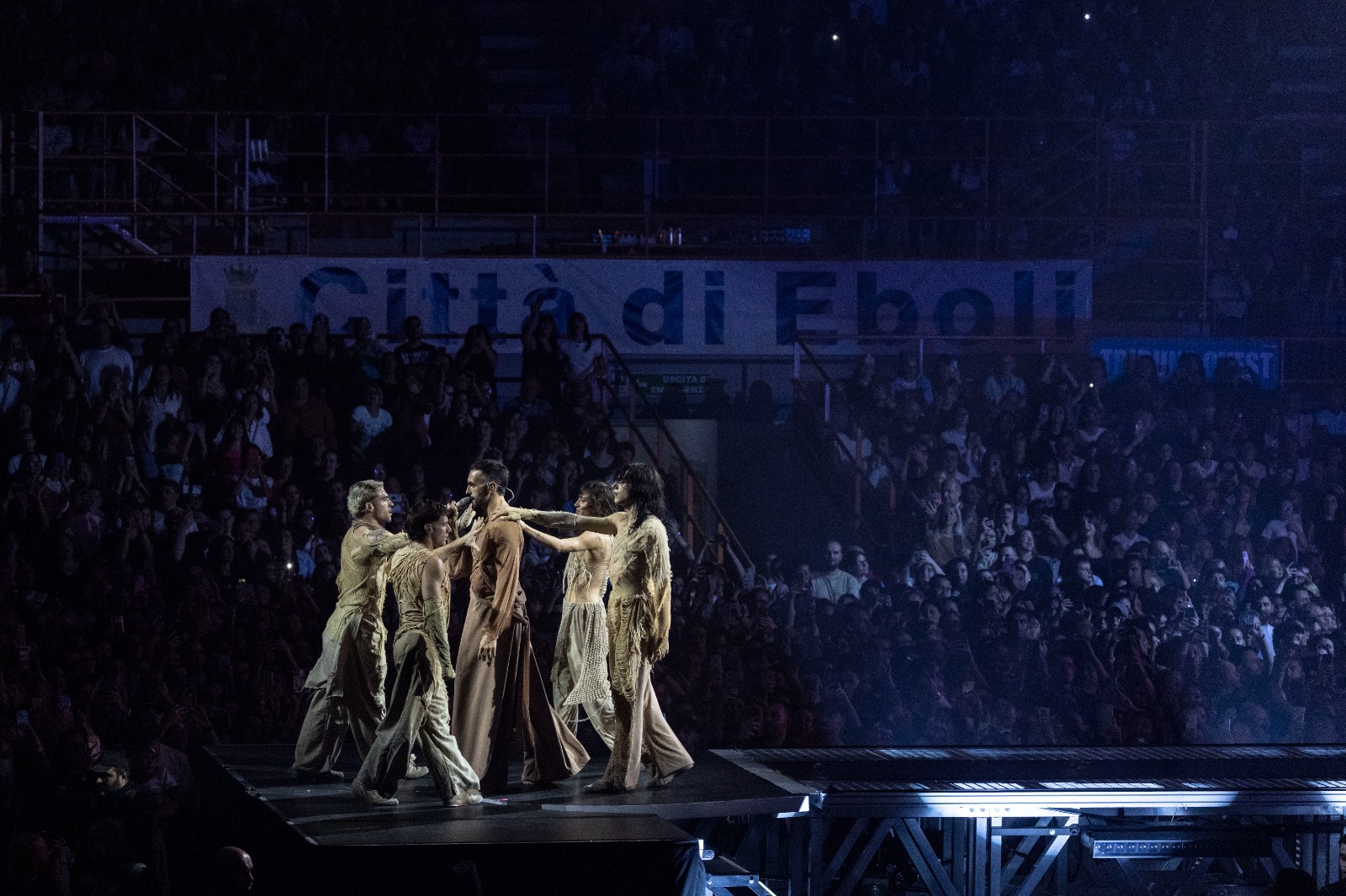 L'ultimo episodio si chiama Catarsi canta brani come Mandare tutto all'aria (2024), Pazza musica (2023), Sto bene al mare (2025). Con Ma stasera (2021) Marco Mengoni entra nel blocco più emotivo dello spettacolo, quello della catarsi, del superamento, della rinascita. La voce, segnata da un evidente raffreddore, tradisce un po' di fatica, ma lui non si risparmia: canta, balla, si dona. È inimmaginabile per lui sottrarsi all'energia che riceve dal pubblico. «A fine concerto ci arrivo, e riesco ancora a parlare» scherza, prima di intonare a sorpresa Perdere l'amore di Massimo Ranieri, creando un momento corale, intimo, quasi sospeso nel tempo. Quando si accendono le luci per leggere i cartelli dei fan, l'atmosfera si trasforma in un piccolo teatro di affetto affettivo. Ne legge uno: “Facci un TikTok", e lui, con un'ironia irresistibile, rispondendo imitando l'accento napoletano. Poi ride, scherza, gioca con il pubblico. È in questi frammenti che Marco Mengoni mostra il suo lato più umano e autentico, quello del ragazzo che sa ancora divertirsi. Parte Io ti aspetto, e il palco diventa una festa collettiva. Marco presenta i suoi esseri viventi incredibili, i performer e i ballerini che lo accompagnano nel viaggio di questo tour. Chiede chi loro venga alla Campania, quasi tutti alzano la mano. «Se migliora il mio napoletano, è solo colpa loro», ride, «perché sto tutto 'o juorno a parlà accussì».