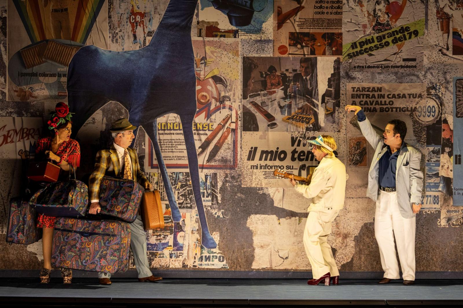 In Muscato questa metamorfosi diventa centrale: il regista sposta l'ambientazione alla fine degli anni Settanta, all'indomani della Legge Basaglia che chiuse i manicomi, e costruisce la scena intorno a un grande pannello-muro forse di un ex ospedale psichiatrico, ricoperto di manifesti pubblicitari con anche un incredibile Franco Battiato nella pubblicità del divano Busnelli, ma ciò che prepondera è la figura di Marco Cavallo, la celebre scultura di legno e cartapesta nata nel 1973 nel manicomio di Trieste come simbolo di libertà e rinascita. Un'immagine che parla da sé: la follia non è più un reato, ma un modo altro di stare al mondo.