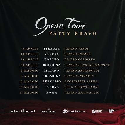 Dall’8 aprile partirà invece l’Opera Tour nei principali teatri, perché la dimensione scenica resta il suo habitat naturale. Patty Pravo non interpreta: abita. Non canta: incarna.