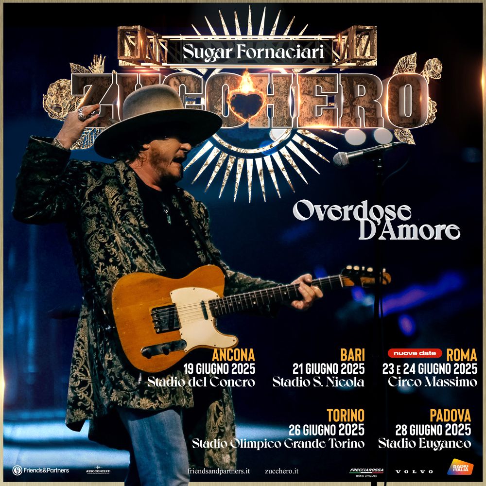 Un altro capitolo straordinario nella carriera di Zucchero si scrive sul palco: dopo il trionfo del Overdose D’Amore World Tour che ha fatto tappa in 20 paesi e coinvolto oltre un milione di spettatori, Zucchero torna a emozionare i suoi fan con sei nuove imperdibili date in Italia. A partire da giugno 2025, il tour Overdose D’Amore attraverserà gli stadi italiani, con tappe a Roma, Bari, Torino, Padova e Ancona. I concerti rappresentano una celebrazione dell’intenso legame tra Zucchero e il suo pubblico, offrendo uno spettacolo ricco di energia e forti emozioni.