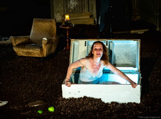 Piedi nudi su una distesa di terriccio. Un lampadario, una cyclette, una lavatrice, un frigorifero disteso a terra: frammenti di quotidianità sommersa che Cosimo Ferrigolo ha disposto in scena come reperti di un naufragio interiore. È in questo paesaggio che Anna Cappelli abita, o forse sprofonda. Perché il progetto scenografico non descrive una casa: materializza una mente, un ricordo, la sedimentazione di tutto ciò che questa donna non è riuscita a trattenere né a lasciar andare.