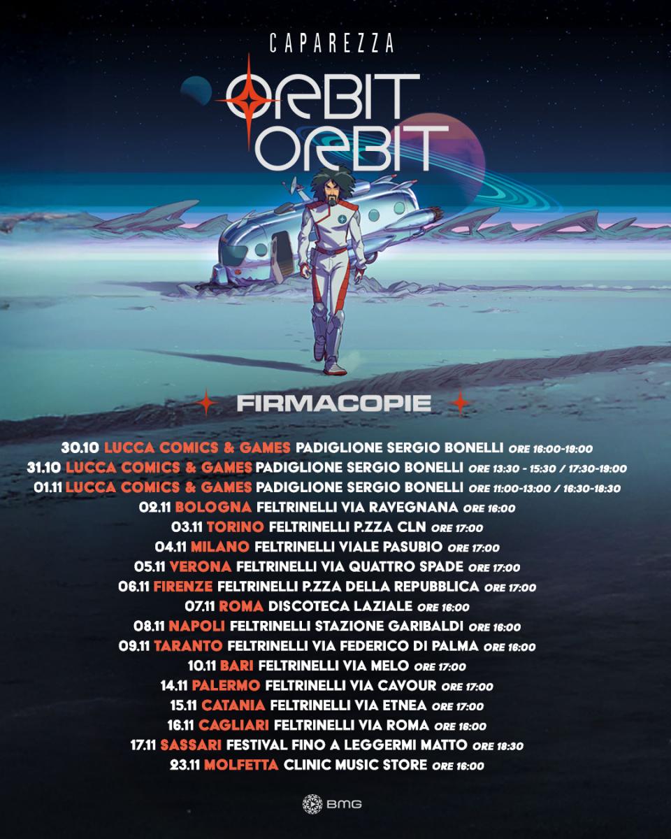 A ottobre e novembre Caparezza incontrerà i fan in una lunga serie di firmacopie in tutta Italia, a partire dai tre giorni di Lucca Comics & Games (30 ottobre - 1 novembre), dove Orbit Orbit farà il suo debutto assoluto.