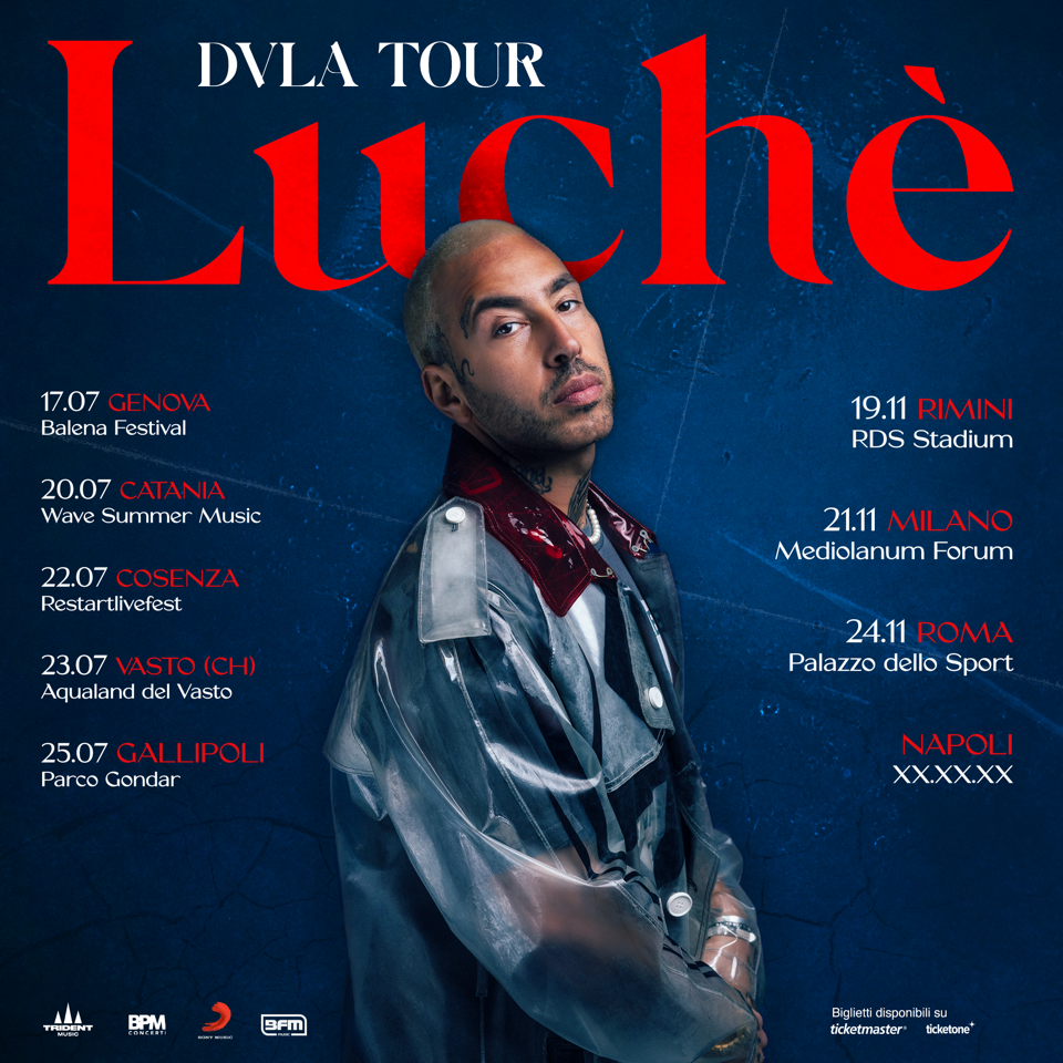 Luchè porterà Dove volano le aquile in tour con una serie di speciali appuntamenti dal vivo, prodotti da BPM Concerti e Trident Music. Dopo aver annunciato le tre date autunnali nei palazzetti (19.11 Rimini - RDS Stadium; 21.11 Milano - Mediolanum Forum; 24.11 Roma - Palazzo dello Sport) BPM Concerti e Trident hanno annunciato cinque nuove date che porteranno l’artista sui palchi dei più importanti festival estivi nel mese di luglio: