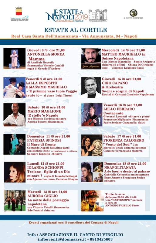 Da stasera fino a domenica 18 agosto, il Cortile della Real Casa Santa dell’Annunziata ospiterà la Rassegna “Estate al cortile”, promossa e sostenuta dall’Assessorato alla Cultura e al Turismo di Napoli e realizzata dall’Associazione Il canto di Virgilio.