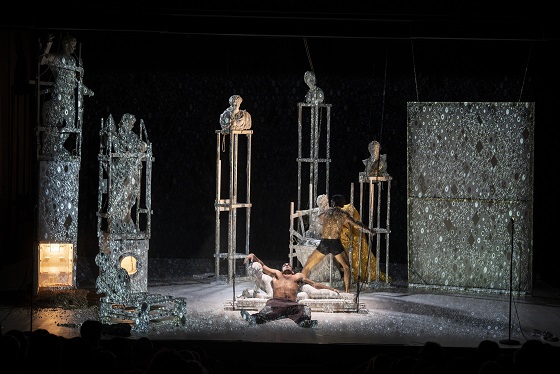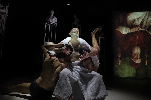 La scena si presenta come una Roma stratificata e contraddittoria: frammenti di statue classiche poggiano su frigoriferi e lavatrici, l’eternità accatastata sull’usa-e-getta, la bellezza imprigionata nella precarietà. È un’immagine potentissima, che sintetizza l’idea di città, e di umanità, proposta dallo spettacolo: luogo di grandezza e miseria, di cultura e abbandono morale. Roma non è sfondo, è organismo. Guarda, assiste, ingoia. Roma viene raccontata come un organismo saturo: marmo e topi, angeli e sangue, bellezza e putrefazione che convivono senza più imbarazzo. Una città dove tutto è già successo e dunque nulla sorprende davvero, nemmeno l’orrore. L’omicidio non è un’eccezione: è una conseguenza. Un precipitato chimico di potere, privilegio, rimozione, droga, omertà affettiva.