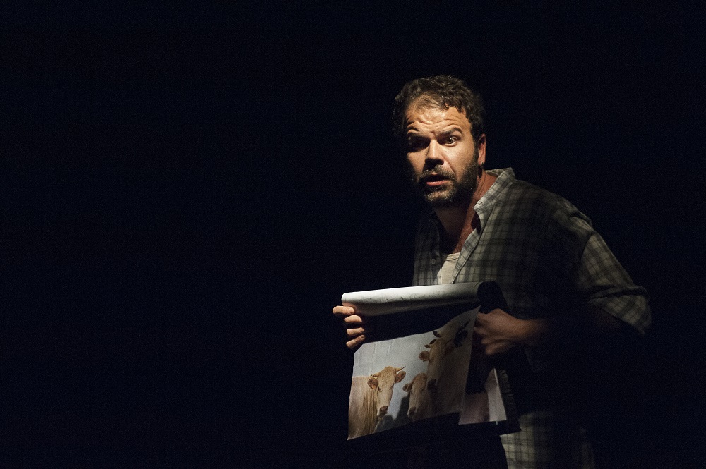 Poi arriva Elia. Confronta giù dal palco, spaesato, con un portalistini pieno di fotografie di mucche scomparse: una figura tragicomica, quasi chapliniana. Eppure è in quel momento che qualcosa cambia. Nello spazio si diffonde, improvvisa, la voce di Cenerentola, So this is love. L'illusione dell'amore come favola: Il mio cuore ha le ali e posso volare, canta la voce del cartone Disney. Ma è un miraggio. Quel sogno di ballo e leggerezza s'infrangerà nel momento più oscuro della pièce, quando Elia, con una brutalità improvvisa e sconvolgente, abuserà di Donata, trattandola davvero come una vacca. Il cortocircuito è completo: la tenerezza ingenua di una ragazzina che cerca amore si trasforma in carne violata. È proprio in questa crudele contraddizione, tra l'incanto e lo squallore, tra il canto e il silenzio, che La Vacca esplode nella sua verità più feroce.