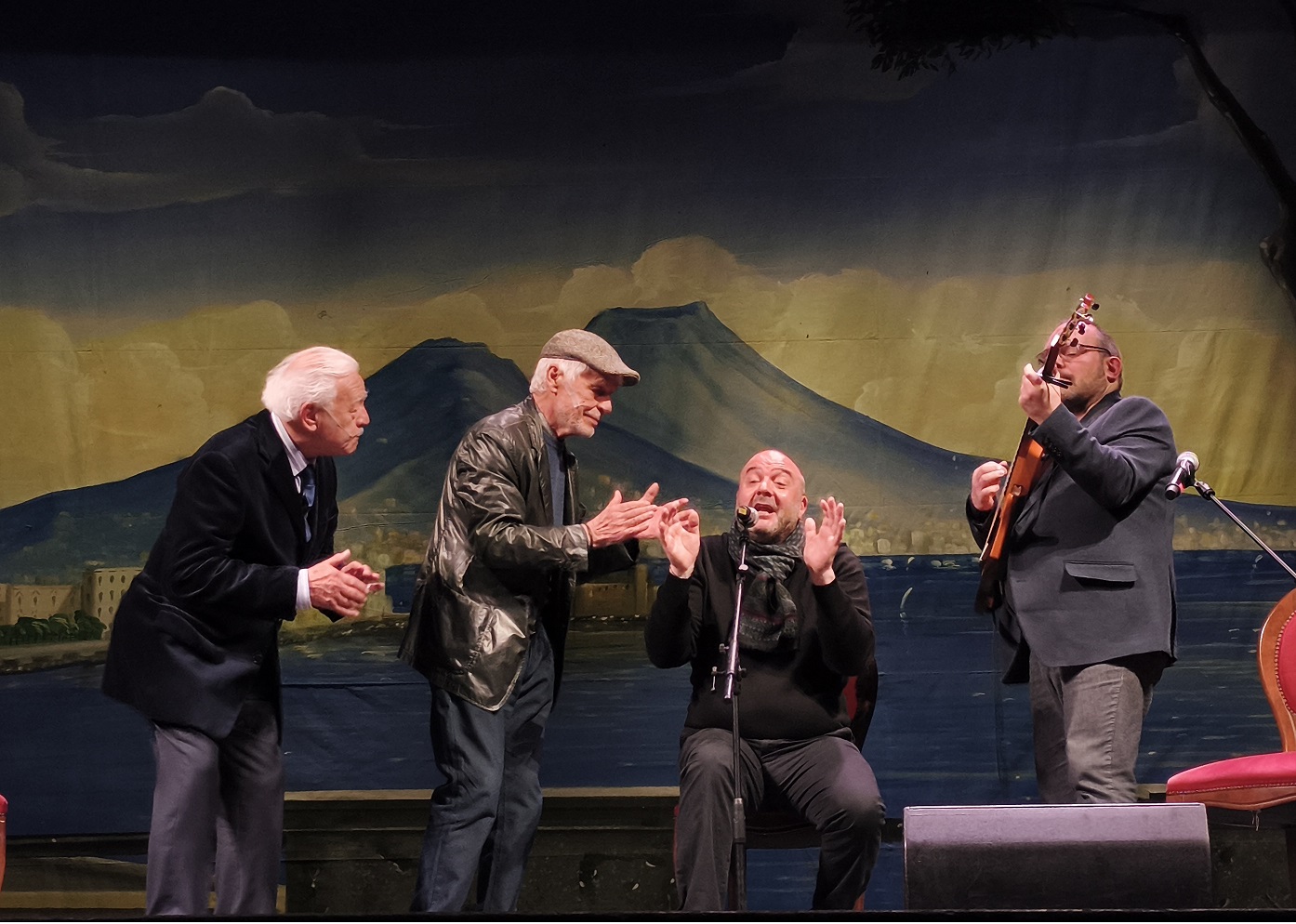 Se Placido è il cuore, Esposito e Saturno sono il battito. Brani come Napule ca se ne va, Era de Maggio, Reginella, fino alla travolgente Tammurriata nera, non sono mai esibizione. Sono narrazione parallela. Gianluigi Esposito ha una voce che accarezza e poi graffia, mentre Antonio Saturno costruisce atmosfere con una chitarra che sembra conoscere ogni vicolo di Napoli. E quando il pubblico viene invitato a cantare, non è un momento “da villaggio turistico”: è comunità. È teatro che si scioglie e diventa piazza.